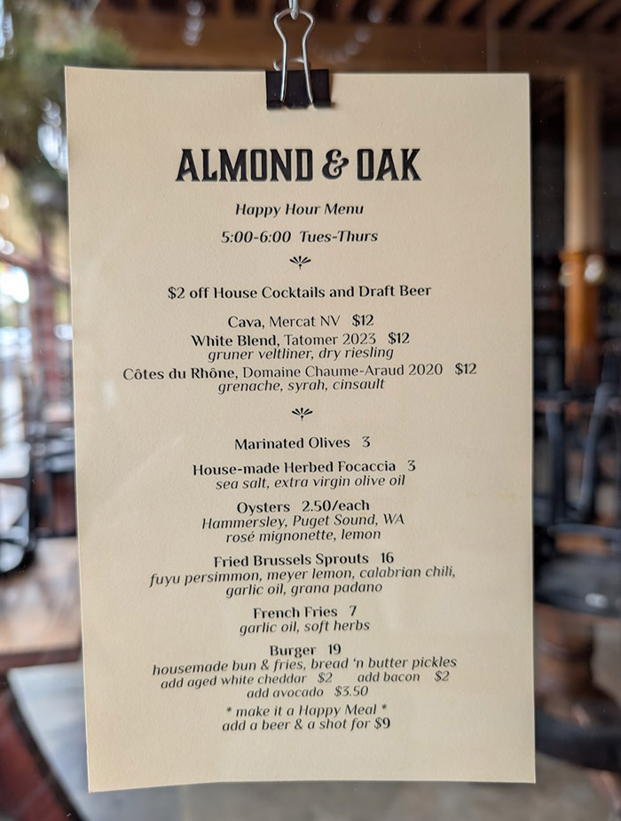 Almond & Oak offers a Happy Hour Menu from Tuesdays to Thursdays, 5:00 – 6:00 pm.