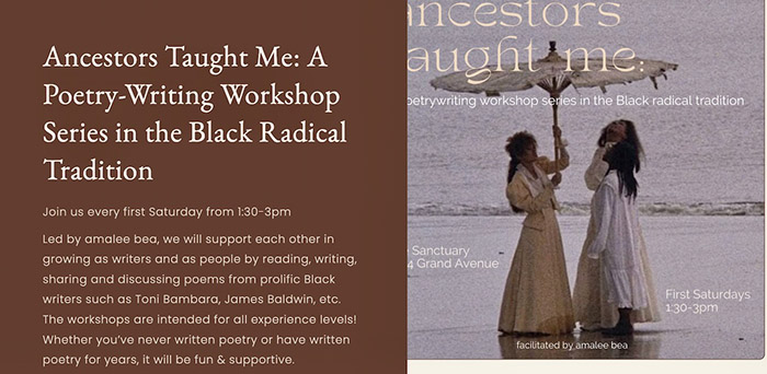 At The Sanctuary, last month’s Harmonia Rosales book-signing event and the “Gourd Beading Workshop” led by their Artist in Residence, Serian Strauss, were both huge successes. On November 1, from 1:30 to 3:00pm, Amalee Bea will lead a poetry-writing workshop titled “Ancestors Taught Me.” Tickets should be purchased in advance on their events page.